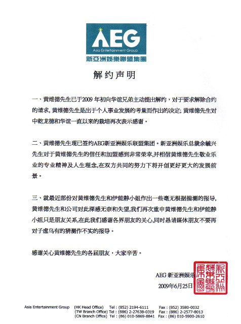 AEG新亞洲娛樂聯(lián)盟集團(tuán)的聲明指,黃維德先生已于2009 年初向華誼兄弟主動提出解約,對于要求解除合約的請求, 黃維德先生是出于個人事業(yè)發(fā)展的考慮而作出的決定。