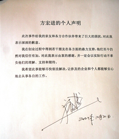 方宏進(jìn)的聲明字?jǐn)?shù)并不多,全文為打印字體,在文末空白處,方宏進(jìn)簽上了自己的名字。一開頭,方宏進(jìn)就道歉,“此次事件給我的親友和各方合作伙伴帶來了巨大的困擾,對此我表示深深的歉意!憋柺軤幾h的方宏進(jìn)直言:“希望此事能夠盡快依法解決,讓涉及的企業(yè)和個(gè)人都能夠安心地從事各自的工作!