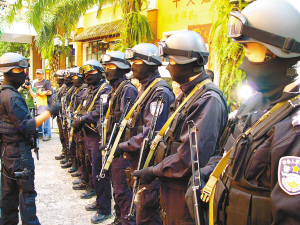 昨天下午,一隊(duì)12人的特警走進(jìn)片場(chǎng),他們蒙著臉,穿著戰(zhàn)術(shù)背心,戴著頭盔和護(hù)目鏡,這些身挎79式微型沖鋒槍、腿掛92式手槍的特警,是劇組專門從景洪市公安局借來的,除了沒裝子彈,所有裝備都是真家伙。