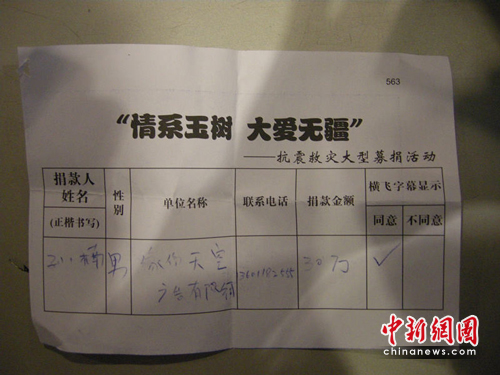 中新網(wǎng)4約0日電 今晚(4月20日)8時(shí),《情系玉樹,大愛無疆——抗震救災(zāi)大型募捐活動(dòng)特別節(jié)目》將在中央電視臺(tái)1號(hào)演播大廳舉行。過百演藝明星參與,在今天下午的排練現(xiàn)場(chǎng),孫楠成為最早一批到達(dá)現(xiàn)場(chǎng)的歌手,并在第一時(shí)間捐出30萬現(xiàn)金,向?yàn)?zāi)區(qū)人民做出一份善舉。