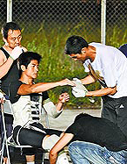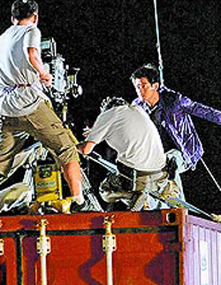 中新網(wǎng)7月29日電 郭富城前晚在港加緊拍《全城戒備》殺青戲,吊鋼絲到2層樓高,再飛身跳到貨柜車頂使出飛刀絕招,相當(dāng)危險(xiǎn)。