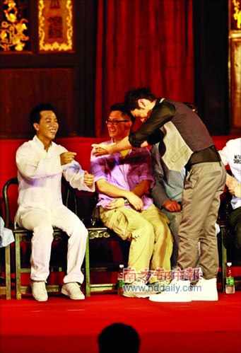甄子丹當(dāng)日以一身白色功夫裝亮相,在隨后的發(fā)布會(huì),眾多媒體見(jiàn)證了他一次收下黃曉明、釋小龍和蔣岱言三位徒弟!昂_x”出來(lái)的“小李小龍”蔣岱言現(xiàn)場(chǎng)耍雙截棍,還虎虎生威地打了一套拳。之后,黃曉明等三人一起向甄子丹敬茶致禮,場(chǎng)面十分溫馨。黃曉明說(shuō)自己今后將多拍“打戲”,但有記者問(wèn):“你怎么一把年紀(jì)了才來(lái)學(xué)武術(shù)?”黃曉明笑言:“活到老學(xué)到老啦。男人應(yīng)該都會(huì)點(diǎn)功夫,有強(qiáng)壯的體魄,才能保護(hù)女人!”