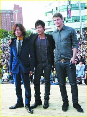 第14屆釜山影展開(kāi)幕以來(lái),喬許·哈奈特(下圖右)、李秉憲(下圖中)與木村拓哉無(wú)疑是最受矚目的3位帥哥,他們連續(xù)幾天都為新作《伴雨行》造勢(shì)。雖然木村拓哉自爆與李秉憲、喬許·哈奈特在酒店內(nèi)飲酒談心,并且他們還用了喝交杯酒的姿勢(shì)喝了很多杯。不過(guò),有地主之利的李秉憲卻完全不顧“酒友”情,在三人同臺(tái)亮相時(shí),腳蹬近5厘米高的鞋跟,站起來(lái)硬是比號(hào)稱176厘米的木村更高一點(diǎn)。