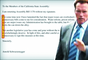 湯姆·阿米阿諾與幾位議員提出了一項法案,希望加州能在舊金山地區(qū)創(chuàng)建基礎設施融資區(qū),采取融資計劃推動這些地區(qū)的基礎設施建設。通常此類法案如果不是問題太多的話,州長會予以批準。但湯姆·阿米阿諾與施瓦辛格素來看不對眼,本月初又在集會上批評施瓦辛格的施政方式,還大罵他是“騙子”。施瓦辛格否決了這項提案,并在否決信上以藏頭詩的形式對阿米阿諾議員予以反擊,即信件每行第一個字母連起來就是“T(Tom),I f k you,A(Arnold Schwarzenegger)”。州長辦公室新聞發(fā)言人稱此事純屬巧合,“試想每天寫那么多否決信,這種巧合的出現(xiàn)是遲早的事!