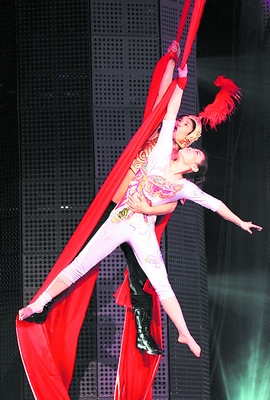 而整個(gè)節(jié)目的高潮,是在小沈陽(yáng)換上露臍的盔甲裝,演唱電影《神話》主題曲。除了賣力演唱,他還在舞臺(tái)上玩了次“武俠”,手抓紅綢緞,抱著女演員在工體館上空飛來(lái)飛去,引得全場(chǎng)尖叫。
