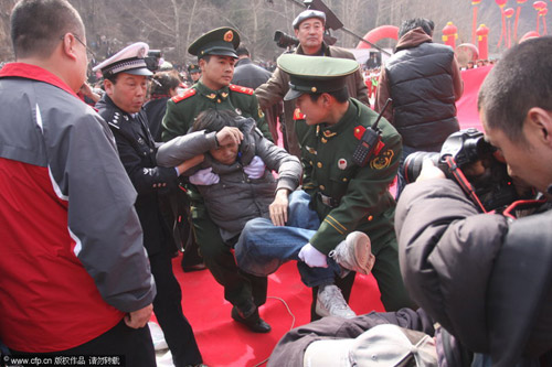 下午1時(shí)50分左右儀式開始,陳凱歌上臺(tái)發(fā)言后,在場圍觀民眾為爭看明星開始出現(xiàn)擁擠,約300民眾涌上一個(gè)高約一米、專為記者拍攝而設(shè)的木制看臺(tái)。大約三分鐘后,看臺(tái)疑不堪負(fù)重,突然倒塌。在前排拍攝的記者如滾地葫蘆般墜地,三角架、攝影機(jī)倒地?fù)p毀。在場的公安、武警將受傷的10名記者抬離現(xiàn)場,送院救治。