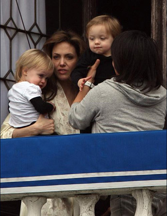 安吉麗娜·朱莉當(dāng)?shù)貢r(shí)間3月26日在位于威尼斯住所的陽(yáng)臺(tái)上抱著龍鳳胎女兒Vivienne、兒子Knox觀賞美景。就在前一天,朱莉曾抱著女兒Vivienne在陽(yáng)臺(tái)上親吻玩樂(lè),而把兒子放在房?jī)?nèi)隔窗而望。此次,身穿白色睡袍的朱莉睡眼朦朧,像是剛睡醒的樣子,她一人抱兩個(gè),生怕被說(shuō)偏心,然而她卻明顯很吃力,抱了一會(huì)便不得不讓保姆出來(lái)幫忙。