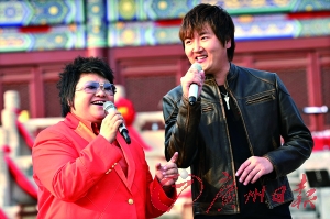 太廟前,韓紅特意一身戎裝亮相,英姿颯爽。她首先抱著吉他走上太廟階梯,以高亢細(xì)膩的嗓音演唱了具有國際性音樂元素的《聽我的聲音》等歌曲,而最后一首西藏風(fēng)格的《歸來》則請三寶親自指揮。