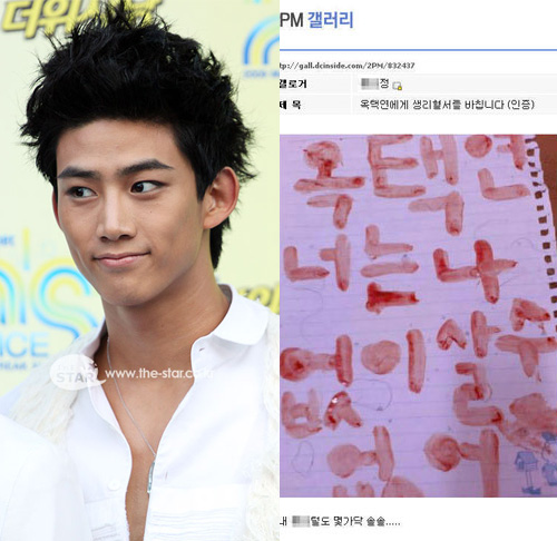“朝鮮日報”消息,上月28日在社交網(wǎng)站DCInside的2PM圖庫中,一名會員上傳了寫有“玉澤演你沒有我就活不了”的血書。一些網(wǎng)民看到后懷疑“是不是用紅墨水寫的假血書?”對此,上傳這份血書的粉絲表示“我說到做到”,并公開了染血的內(nèi)衣。