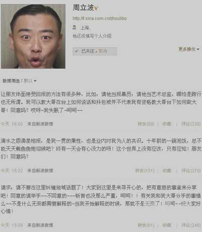 采訪首先圍繞關(guān)周分手。周立波說(shuō):“我很無(wú)辜,老關(guān)也很無(wú)辜,有人在中間挑事,我們會(huì)查的!彼嬖V記者,知道媒體“踢爆”兩人分手一事時(shí),他正在與前紐約警察局華人局長(zhǎng)莫虎一起喝酒,而當(dāng)天下午他剛在無(wú)畏號(hào)航母上看了“珍珠港事件”的紀(jì)錄片,當(dāng)時(shí)他的第一個(gè)反應(yīng)是“沒(méi)想到我也遇上珍珠港事件了”。由于當(dāng)時(shí)認(rèn)為是關(guān)棟天向媒體“踢爆”此事,而且當(dāng)晚酒喝得比較多,因而在微博上寫(xiě)下了幾段很有爭(zhēng)議的博文,包括“泡飯鮑魚(yú)”說(shuō)。“結(jié)果阿春(孫徐春)用人格向我擔(dān)保決不是‘老怪頭’(周立波和孫徐春對(duì)關(guān)棟天的昵稱)說(shuō)出去的,我相信他。”周立波表示,此次分手只是藝術(shù)和商業(yè)上的分手,兩人的藝術(shù)觀點(diǎn)不同。