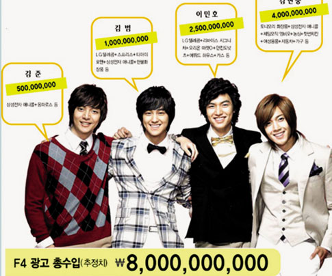 李民浩、金賢重等《花樣男子》主演們也身價(jià)倍增,“韓版F4”的各種廣告收入加起來(lái)已經(jīng)超過(guò)了80億韓元。