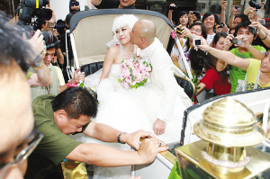 昨天下午馬尼拉的天氣有些陰沉,較為涼爽。由于張衛(wèi)健和張茜都是虔誠的天主教徒,兩人的婚禮也按照傳統(tǒng)的天主教婚禮進(jìn)行。圣奧古斯丁大教堂是馬尼拉當(dāng)?shù)刈罟爬系慕烫,距今已有五百多年的歷史。雖然張衛(wèi)健和張茜的婚禮在此舉行,但是教堂內(nèi)部并沒有進(jìn)行更多特別的布置,只是在紅毯兩旁每隔十米擺放了一個高達(dá)兩米的綠植,枝干部分則是由不同顏色的玫瑰組成的大團(tuán)花束,充滿了宗教婚禮的神圣莊嚴(yán)。下午兩點一刻,身穿白色禮服的張衛(wèi)健和媽媽先行到達(dá)圣奧古斯丁大教堂。大約一刻鐘后,張茜也在媽媽的陪同下乘坐馬車來到教堂。張茜身穿一襲曳地銀白裹胸婚紗,紗裙上點綴著白色花瓣,隨著走動的步伐上下擺動,充滿動感,而她上半身綴滿的水晶則將整個人襯托得高貴非常。值得一提的是,張茜當(dāng)天的造型由著名形象設(shè)計師陳非一手打造,團(tuán)簇的頭紗下白色的假發(fā)別具一格,和白色婚紗相得益彰。