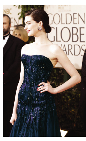 雖然沒(méi)有領(lǐng)到“金球”,但是安妮·海瑟薇在紅地毯上分外搶眼,鑲有藍(lán)色寶石的孔雀型耳環(huán)與寶石藍(lán)金絲裹胸禮服相得益彰!