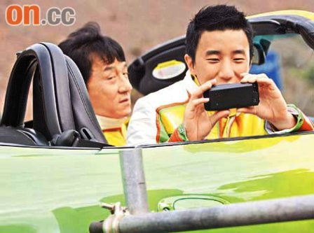 昨日清晨七時,成龍與祖名穿超時空戰(zhàn)士的“父子裝”抵達青馬大橋,駕駛熒光黃色和綠色的左跑車,車尾則放了一大箱冰凍道具樽裝茶,非常搶眼。坐在司機位的成龍在公路上風馳電掣,狀甚威風,其實他們的跑車被固定在貨車托尾板上,相反攝影師要站在托尾板上拍攝,當有大風或大貨車經(jīng)過扯風時,令攝影師搖搖欲墜,驚險萬分。
