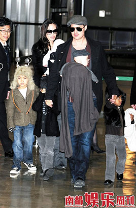 近日,好萊塢人氣情侶安吉麗娜·朱莉和布拉德·皮特赴日本為新片做宣傳。隨行的還有他們的幾個(gè)孩子:親生女希洛、來(lái)自柬埔寨的大養(yǎng)子麥多克斯、越南養(yǎng)子派斯汀、非洲養(yǎng)女薩哈拉,最令人驚喜的是,他們還帶上了去年七月剛剛誕下的一對(duì)龍鳳胎小寶貝。安吉麗娜將女兒薇薇妮背在胸前,皮特則背著兒子諾克斯,兩個(gè)小家伙都胖乎乎的,十分惹人喜愛(ài)。據(jù)美國(guó)《Star》雜志爆料,這對(duì)小寶寶生下后就體弱多病,而且是一種神秘的慢性疾病,因此皮特二人一直不讓他們現(xiàn)身露臉。安吉麗娜和皮特此行故意讓龍鳳胎寶貝大方曝光在鏡頭下,似有意要以寶寶真身?yè)魸⑦@種傳言。