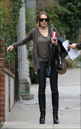 情人節(jié)當(dāng)天和同性女友 Samantha Ronson大吵架的林賽·羅韓好像已經(jīng)緩和了,兩個(gè)人被拍到在紐約街頭。當(dāng)天的林賽實(shí)在是范的不一般,咖啡色的開身毛衣,搭配里面的半透明的咖啡衣服,內(nèi)衣若隱若現(xiàn)性感非常,下身則是緊身的深藍(lán)色牛仔褲黑色的高跟靴子,襯得雙腿修長(zhǎng)。最重要的是手里的黑色機(jī)車服,這個(gè)道具已經(jīng)出現(xiàn)在很多明星的手里了,看來想讓機(jī)車服不熱都不成了。