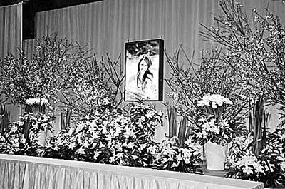飯島愛的遺體告別式現(xiàn)場布置得非常肅穆,中央場地懸掛了飯島愛遺照,是由日本知名攝影師筱山紀(jì)信拍攝的,曾刊登在《婦人公論》上。同時(shí)祭壇上還擺滿了飯島愛生前最喜歡的卡薩布蘭卡,這種花的花語是永不磨滅的愛情,象征了家人友人,以及粉絲們對飯島愛永不磨滅的愛。周圍用樹枝和純白鮮花做裝飾,場地整體顯得肅穆莊重。