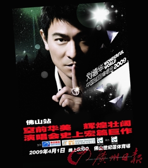 他成就了一種精神——永不言敗,他鑄就了一個(gè)榜樣——奮斗不息,他就是華人演藝圈的“勞模”——?jiǎng)⒌氯A。在2009本命年,劉德華將把 “Wonderful World(奇幻世界)”巡回演唱會(huì)帶到中國(guó)內(nèi)地,馬不停蹄地與各地樂(lè)迷分享他出道以來(lái)最豪華的演唱會(huì)。而值得廣東樂(lè)迷開(kāi)心的是,劉天王將于3月20日和4月1日分別登陸廣州奧林匹克中心和佛山世紀(jì)蓮體育場(chǎng),兩場(chǎng)演唱會(huì)都可容納3萬(wàn)多樂(lè)迷。