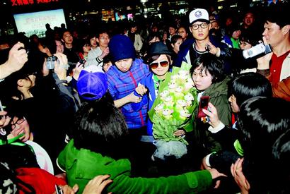 在歌聲與口號(hào)聲中,頭戴小禮帽、以乖乖學(xué)生模樣打扮的周筆暢亮相了,剎那間,筆親們的聲浪掀翻候機(jī)大廳,鮮花、閃光燈,一股腦兒涌向她,倒讓半年未公開露面的周筆暢有些局促,紅著臉揮著手,靦腆地環(huán)顧擁擠的人群。