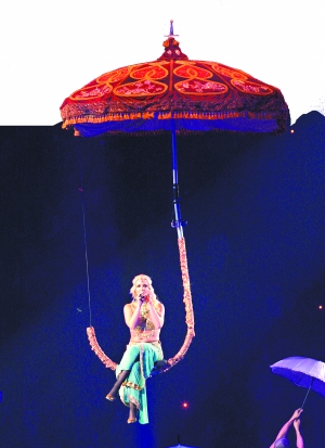 3月初,“小甜甜”布蘭妮展開她的復出巡回演唱會, 多變的造型堪比麥當娜,內衣外穿,野蠻女警等造型都堪稱火辣。為配合新專輯《馬戲團》,布蘭妮打扮成馬戲團表演者,在舞臺上奉獻了很多雜技表演,她還蒙上眼睛與兩名男舞者一起跳舞一起演唱《Touch of My Hand》。她在高空坐在“傘柄”上以印度舞娘造型出場,遠看甚為驚艷,近看發(fā)現她腹部堆積著贅肉,跳肚皮舞倒是不錯?磥聿继m妮還需要減肥。