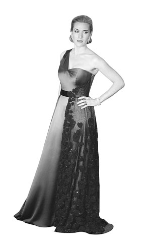 凱特·溫斯萊特所穿的是圣羅蘭品牌的鐵灰色單肩禮服,價(jià)值數(shù)千美元。