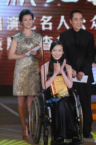 雖然執(zhí)導(dǎo)國慶60周年焰火晚會重任在肩,但是昨天張藝謀依然來到盛典現(xiàn)場,領(lǐng)取了“中國最杰出成就榮譽(yù)”和“中國公眾滿意度最佳演藝名人”榮譽(yù),并擔(dān)任頒獎嘉賓。更為難得的是,獲得“中國年度舞蹈最佳表現(xiàn)女演員”提名的舞蹈演員劉巖也坐著輪椅出現(xiàn)在現(xiàn)場。這是手術(shù)之后的劉巖首次公開亮相公眾場合。劉巖原本是北京奧運(yùn)會獨(dú)舞《絲路》的A角,但是由于車臺操作失誤,造成劉巖從近3米高空踩空、墜落,導(dǎo)致她嚴(yán)重受傷,并為此付出了無可挽回的代價……