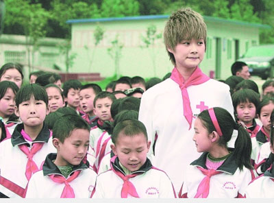 稍后,海虹小學的所有學生都在操場上集合,春春身邊的小朋友從7、8個增加到100多個。人一多,場面就不好控制,這邊的孩子剛排好隊,那邊就有人咳嗽,要不就是忘記面帶微笑。李宇春和孩子們熟悉起來,還鼓勵他們笑起來,“只要我們持續(xù)關(guān)愛四川,就會萬物復蘇,奇跡來臨……”全場一起喊出最后的話:“四川依然美麗,中國更加美麗!”小朋友們和這位大姐姐一起面對鏡頭揮手,現(xiàn)場氣氛達到了最高潮。