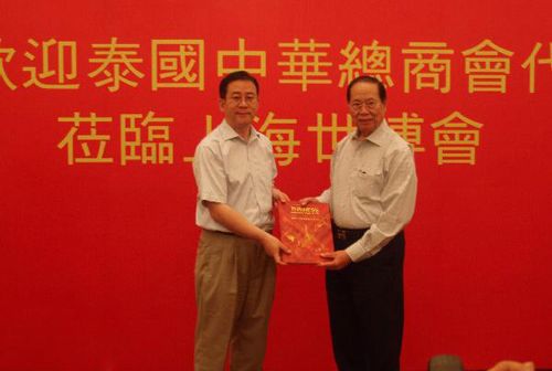 當(dāng)晚,泰國(guó)中華總商會(huì)在下榻賓館舉行晚宴,該會(huì)主席吳宏豐代表全體客人向國(guó)務(wù)院僑辦、上海市僑辦、上海世博局等給予他們的優(yōu)厚禮遇表示衷心感謝。專程抵滬參加指導(dǎo)接待泰國(guó)客人的國(guó)僑辦國(guó)外司副司長(zhǎng)董傳杰和上海市僑辦主任崔明華分別在晚宴上發(fā)表了熱情洋溢的講話,雙方還交換了紀(jì)念品。