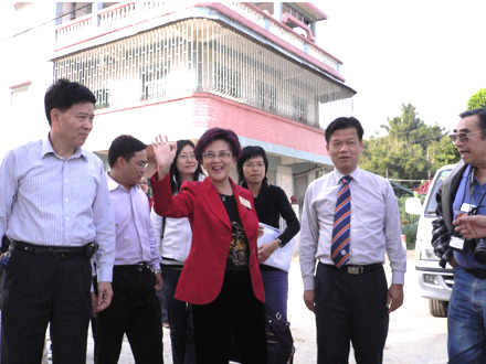 當(dāng)趙譚美生夫婦在開(kāi)平市外僑局、僑聯(lián)干部的陪同下,回到她73年來(lái)第一次見(jiàn)到的故里——開(kāi)平市赤坎鎮(zhèn)塘美村委會(huì)長(zhǎng)慶里,甫一下車(chē),就受到在此等候多時(shí)的開(kāi)平市政協(xié)副主席、統(tǒng)戰(zhàn)部部長(zhǎng)關(guān)位湛,開(kāi)平市外僑局局長(zhǎng)、僑聯(lián)主席馮立本,副局長(zhǎng)梁海燕,紀(jì)撿組長(zhǎng)余智廣,赤坎鎮(zhèn)鎮(zhèn)長(zhǎng)張偉業(yè),以及當(dāng)?shù)馗刹咳罕娨话俣嗳说臒崆榻哟。鄉(xiāng)親們敲鑼打鼓,舞起瑞獅,然放鞭炮,熱烈歡迎趙譚美生夫婦回鄉(xiāng)探親。