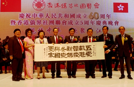 中新網(wǎng)9月29日電 9月24日晚,香港僑界社團(tuán)聯(lián)會(huì)在香港伊利沙白體育館舉辦慶祝中華人民共和國(guó)成立60周年暨香港僑界社團(tuán)聯(lián)會(huì)成立5周年慶典,香港特區(qū)行政長(zhǎng)官曾蔭權(quán)、中央政府駐港聯(lián)絡(luò)辦主任彭清華、副主任黎桂康、外交部駐港特派員公署特派員呂新華、全國(guó)政協(xié)港澳臺(tái)僑委員會(huì)副主任林兆樞、國(guó)務(wù)院僑辦副主任許又聲、中國(guó)僑聯(lián)副主席王永樂(lè)以及香港各界僑胞近3000人出席了慶典。