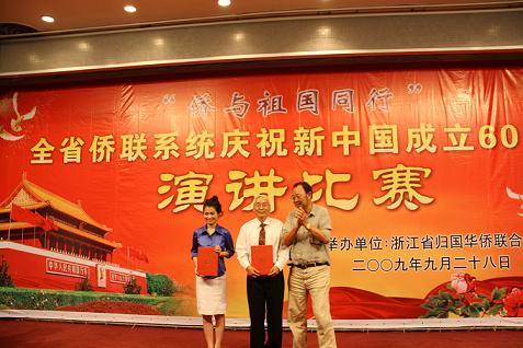為慶祝新中國(guó)成立六十周年,浙江省僑聯(lián)于9月28日下午,在浙江圖書(shū)館二樓報(bào)告廳舉辦了以“僑與祖國(guó)同行”為主題的全省僑聯(lián)系統(tǒng)演講比賽活動(dòng),由各市僑聯(lián)推薦的、來(lái)自全省僑界各行各業(yè)的19名參賽選手參加了比賽活動(dòng)。