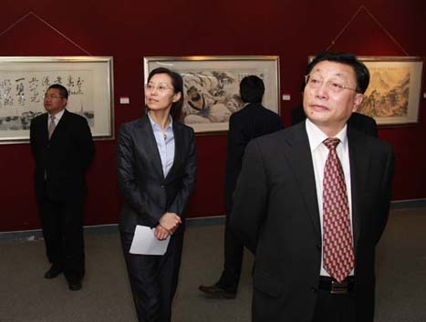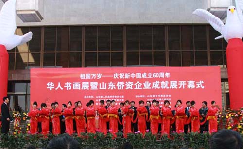 中新網(wǎng)11月10日電 據(jù)山東省僑辦消息,“祖國(guó)萬歲——慶祝新中國(guó)成立60周年華人書畫展暨山東僑資企業(yè)成就展”大型宣傳展覽活動(dòng)11月6日在濟(jì)南拉開帷幕。國(guó)務(wù)院僑辦副主任馬儒沛、省政協(xié)副主席李德強(qiáng)、著名書畫家劉寶純出席活動(dòng)開幕式并為活動(dòng)剪彩。省僑辦主任王琳在開幕式上致辭,省僑辦黨組書記朱緒平主持開幕式。