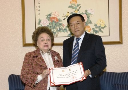 會見時,林軍向陳香梅女士頒發(fā)中國僑聯(lián)顧問聘書。