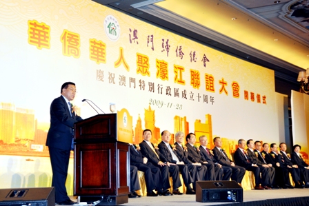 中新網(wǎng)11月25日電 據(jù)中國僑聯(lián)網(wǎng)站消息,11月23日至24日,由澳門歸僑總會主辦的“2009華僑華人聚濠江聯(lián)誼大會”在澳門舉行。中國僑聯(lián)主席林軍,國務(wù)院僑辦副主任許又聲以及來自世界56個國家和地區(qū)的華僑華人代表以及內(nèi)地僑界嘉賓共1000多人應(yīng)邀出席。澳門特別行政區(qū)行政長官何厚鏵到會講話,中央人民政府駐澳門聯(lián)絡(luò)辦副主任徐澤、外交部駐澳門特派員盧樹民等到會祝賀。