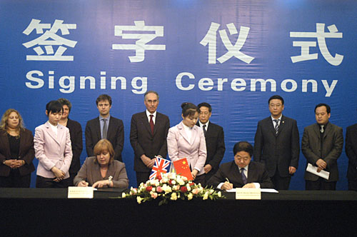 副市長周慕冰、英國駐華大使歐·威廉爵士、市政府外僑辦主任郝明出席簽字儀式。市政府外僑辦副主任王雯主持簽字儀式。