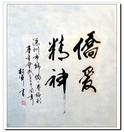 根據年初深圳市僑聯常委會的會議精神及市歸僑僑眷福利基金會的工作計劃,基金會將舉辦市歸僑僑眷福利基金會20周年紀念活動,以對所有支持關心過基金會的領導和社會知名人士表示感謝,并出一本基金會紀念冊,以紀念基金會成立以來的風雨歷程。當參加廣東省第九次僑代會的廣東省僑聯常委、深圳市歸僑僑眷福利基金會副理事長劉偉良邀請林軍為市歸僑僑眷福利基金會題詞時,林軍欣然應允,當即揮筆疾書“僑愛精神”,為市歸僑僑眷福利基金會成立20 周年獻禮。