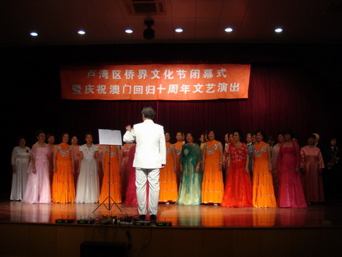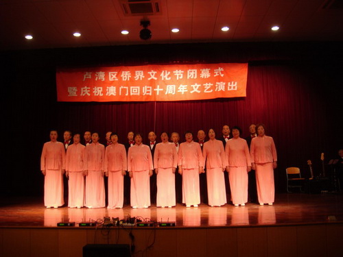 一首優(yōu)美動聽的《七子之歌—澳門》拉開了盧灣區(qū)僑界文化節(jié)閉幕式暨慶祝澳門回歸十周年文藝演出的序幕,來自區(qū)內(nèi)僑界親情中華藝術(shù)團、五里社區(qū)、打浦社區(qū)、SUNDAY合唱團的各種歌曲、大合唱、時裝表演、器樂演奏、上海說唱等節(jié)目你方唱罷我登場,充分展示了盧灣區(qū)僑界文化節(jié)活動的豐富多彩,充分展示了盧灣區(qū)僑界群眾的良好風(fēng)貌。