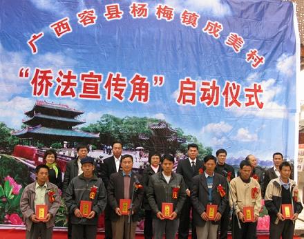 “僑法宣傳角”是國務(wù)院僑辦開展“五五”普法、宣傳《中華人民共和國歸僑僑眷保護(hù)法》及其實施辦法的一項重要舉措。玉林市外事僑務(wù)辦積極推薦并爭取到在楊梅鎮(zhèn)成美村設(shè)立“僑法宣傳角”。成美村有人口4000多人,有歸僑僑眷3600多人、海外僑胞4280多人,有僑屬企業(yè)2家。該村黨總支部、村委會辦公設(shè)施先進(jìn),功能室健全,每天到村辦事、開會、讀報、學(xué)技術(shù)、娛樂的人員均有百人以上,并重視宣傳僑法、維護(hù)歸僑僑眷的合法權(quán)益,聘請了27位村民小組長、村民代表為“僑法宣傳角”義務(wù)宣傳服務(wù)員。在這里設(shè)立“僑法宣傳角”,有利于廣泛深入地開展僑法集中宣傳活動,加大僑法宣傳貫徹落實力度,進(jìn)一步營造愛僑、護(hù)僑、惠僑的良好社會環(huán)境。