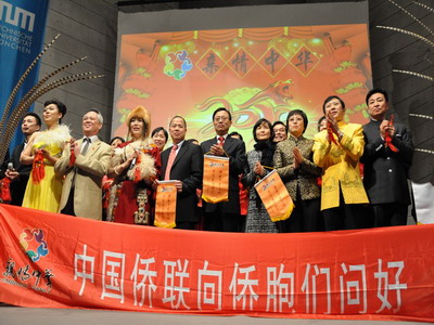 中新網(wǎng)1月6日電 據(jù)中國外交部網(wǎng)站消息,2010年1月3日晚,中國僑聯(lián)組織的“親情中華”藝術(shù)團(tuán)歐洲之行首場演出在德國慕尼黑舉行。慕尼黑總領(lǐng)事馬晉生和夫人劉霞、領(lǐng)館館員及慕尼黑工業(yè)大學(xué)副校長孟麗秋、巴州華商會、僑學(xué)界、中資機(jī)構(gòu)和一些德國友人約800人觀看演出。