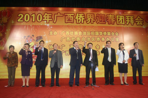 團(tuán)拜會(huì)上,廣西自治區(qū)僑聯(lián)、僑辦領(lǐng)導(dǎo)班子集體上臺(tái)向與會(huì)嘉賓拜年。隨后,文藝演出時(shí)高潮迭起,精彩不斷;抽獎(jiǎng)過程中,驚喜陣陣,笑聲連連。在不知不覺中,與會(huì)嘉賓們回顧了過去一年的工作成績、描繪了新年的工作藍(lán)圖、暢敘了友情、加強(qiáng)了聯(lián)誼,度過了一個(gè)歡快祥和的夜晚。