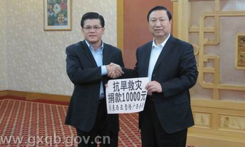 3月26日,馬來(lái)西亞雪隆廣西會(huì)館和泰國(guó)廣西總會(huì)永遠(yuǎn)名譽(yù)會(huì)長(zhǎng)饒培中到訪廣西,馮祖華接待了到訪的客人,向他們通報(bào)了廣西的旱情,馬來(lái)西亞雪隆廣西會(huì)館和泰國(guó)廣西總會(huì)永遠(yuǎn)名譽(yù)會(huì)長(zhǎng)饒培中當(dāng)即分別向廣西災(zāi)區(qū)捐款一萬(wàn)元和一千元。