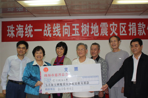 中新網(wǎng)4月22日電 據(jù)珠海外僑局消息,4月20日下午,廣東省珠海市委統(tǒng)戰(zhàn)部在三樓大廳舉行為青海玉樹地震災(zāi)區(qū)捐款儀式,珠海市新馬泰的僑友在副會長車玉屏、張舉安的帶領(lǐng)下共捐款2800元,為青海玉樹地震災(zāi)區(qū)獻(xiàn)上珠海特區(qū)僑友的一片愛心。