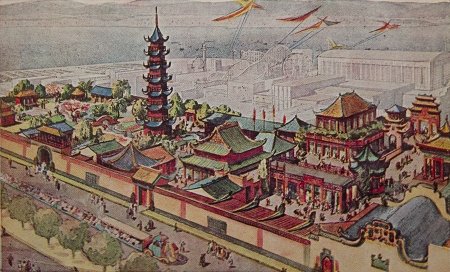 根據(jù)有關(guān)資料,“中國村”入口大門是一座巨大的牌坊,上面書寫著“華商展覽場(chǎng)”幾個(gè)大字!爸袊濉眱(nèi)設(shè)有兩個(gè)酒家、兩座戲院、一座神廟和一座七層高的佛塔。“佛塔是中國村內(nèi)最高建筑!眴涛陌步榻B,“中國村”內(nèi)還建了一個(gè)陳列館和一二十家商店,分別展出中國的各類民間工藝品、瓷器、茶葉,還有少量具備科技含量的產(chǎn)品。