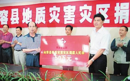 為了支持災(zāi)區(qū)重建,幫助受災(zāi)群眾共渡難關(guān),6月8日,容縣僑屬企業(yè)廣西黑五類食品集團(tuán)、廣西南山瓷器有限公司等積極響應(yīng)當(dāng)?shù)卣?hào)召,紛紛行動(dòng)起來,慷慨解囊,積極向遭受地質(zhì)災(zāi)害地區(qū)捐款。其中廣西黑五類食品集團(tuán)捐款50萬元,廣西南山瓷器有限公司捐款25萬元。