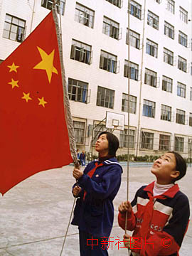 上海東風(fēng)中學(xué)虞維詩(右)是澳門籍學(xué)生,在澳門回歸前的這一個(gè)星期中,學(xué)校特地將每天清晨升國旗的任務(wù)交給她。圖為虞維詩17日與同學(xué)一起升國旗的情景。